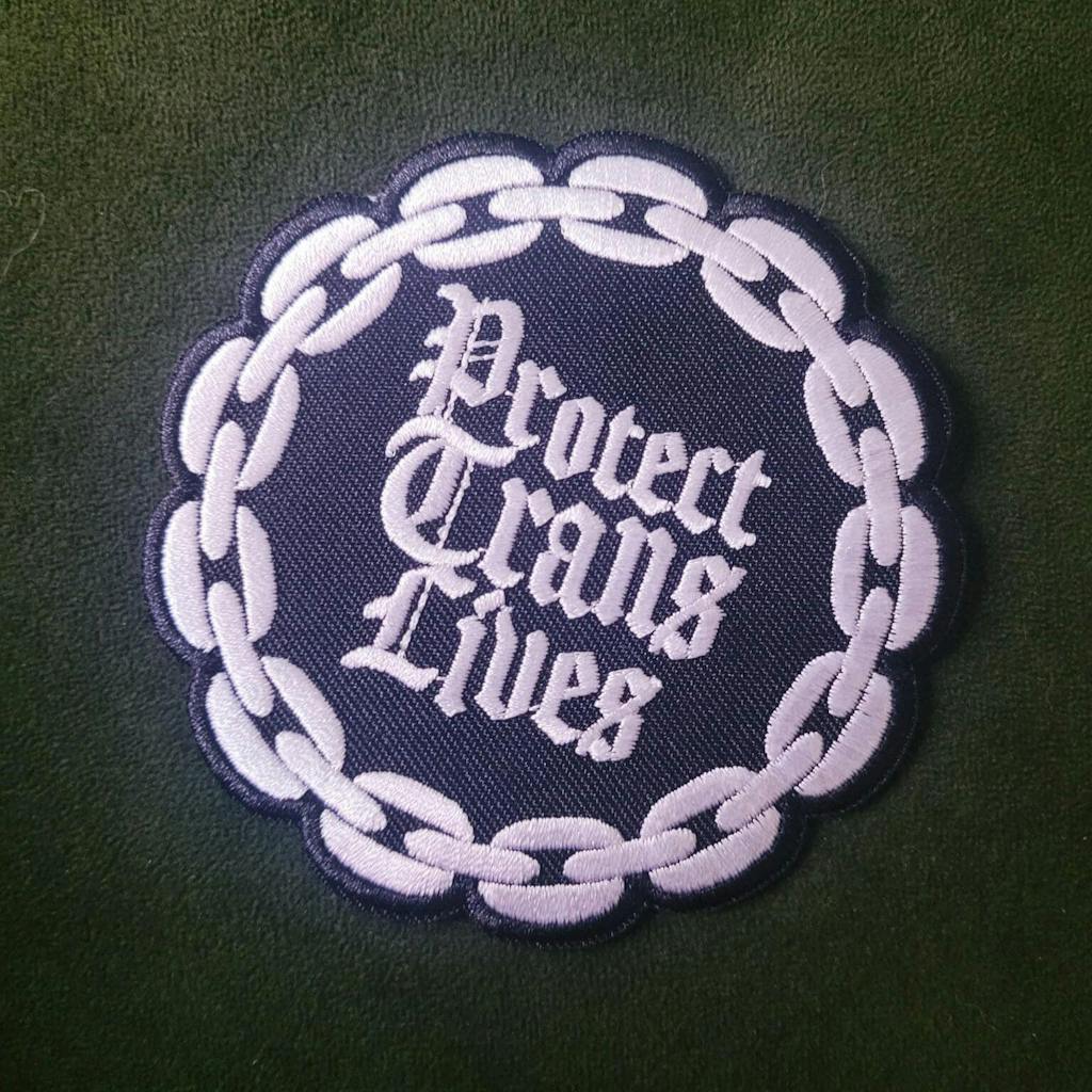 Stand up for trans rights with our "Protect Trans Lives" Patch. This round black patch features a powerful white embroidered slogan and chain design, symbolizing trans empowerment and solidarity. With its vegan iron-on adhesive backing, this patch is easy to apply on jackets, bags, and various clothing items, making it perfect for expressing your support while also adding a touch of style. Join the movement and spread awareness about the importance of trans rights with this impactful accessory.